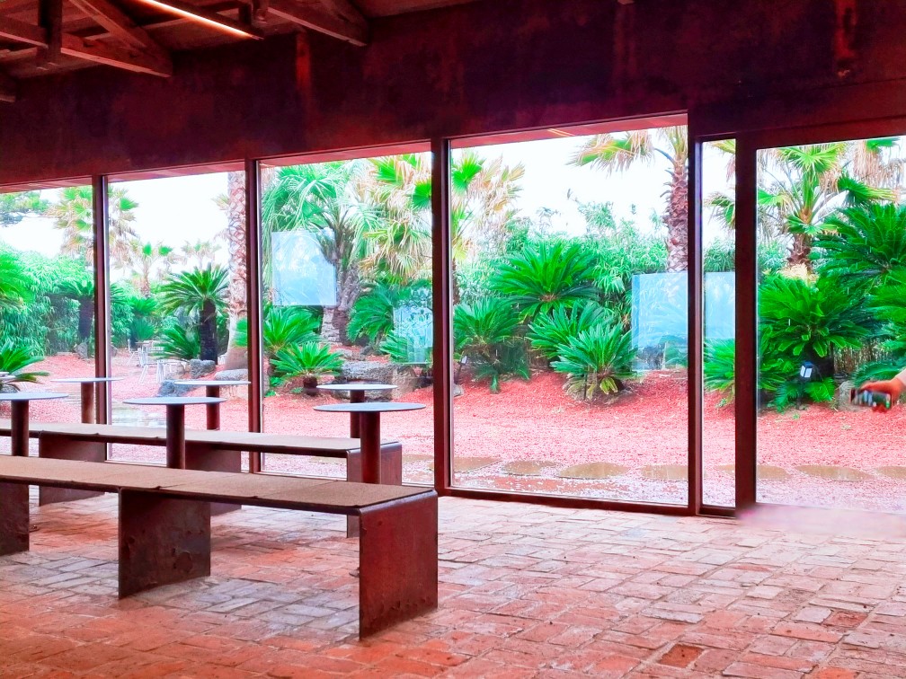 통창 밖으로 나가면 붉은 화산석과 야자수가 어우러진 정원이 있습니다.
