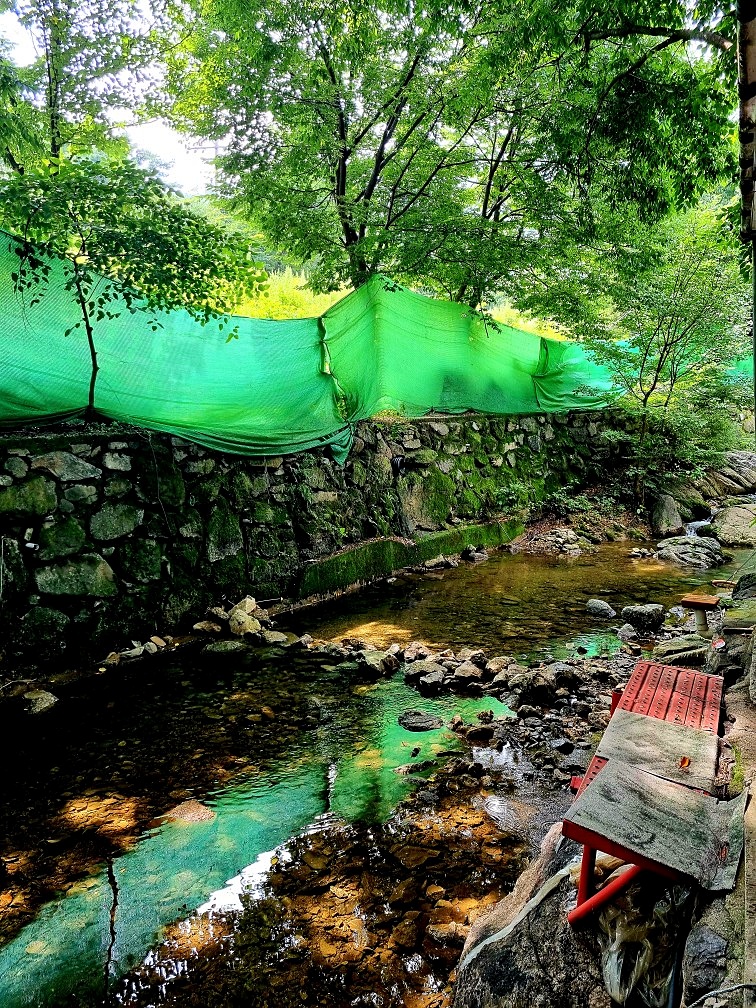 식당은 계곡 옆에 그늘막과 평상이 있습니다.