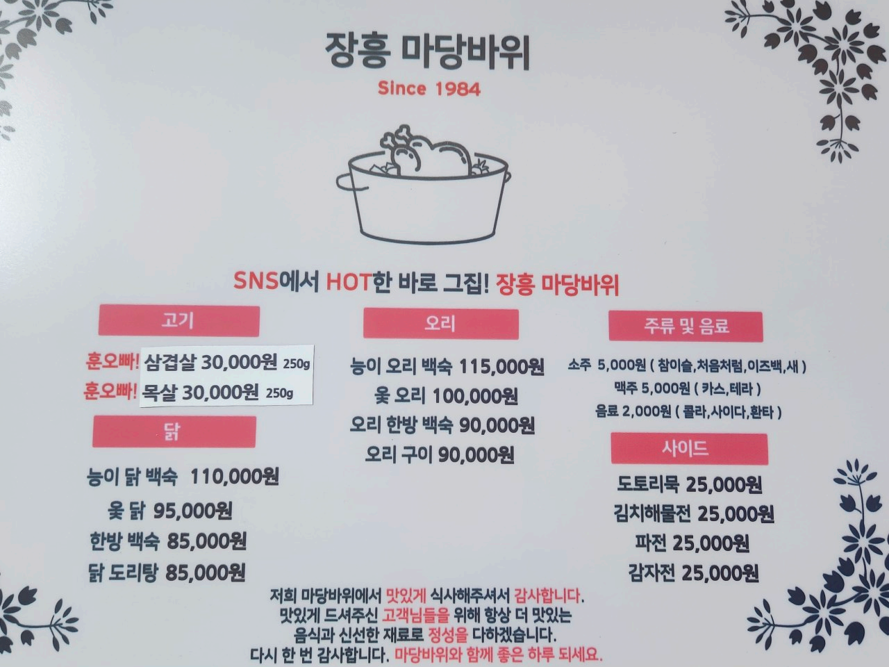 - 주소: 경기 양주시 장흥면 권율로 309번 길 317-38 마당바위 장흥본점