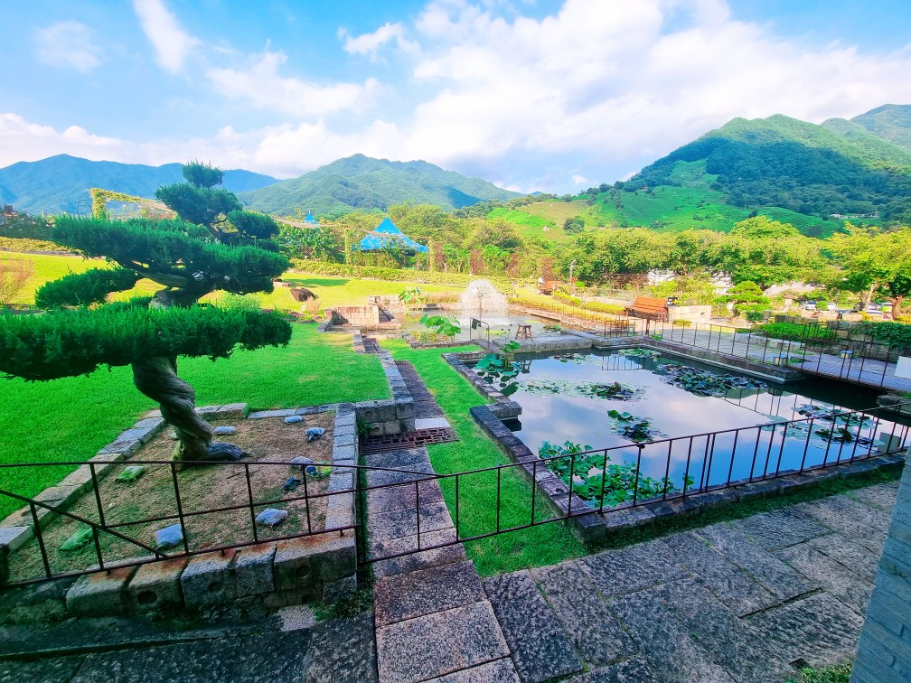 아름다운 야외 정원, 지리산을 배경으로 한 멋진 전망,
