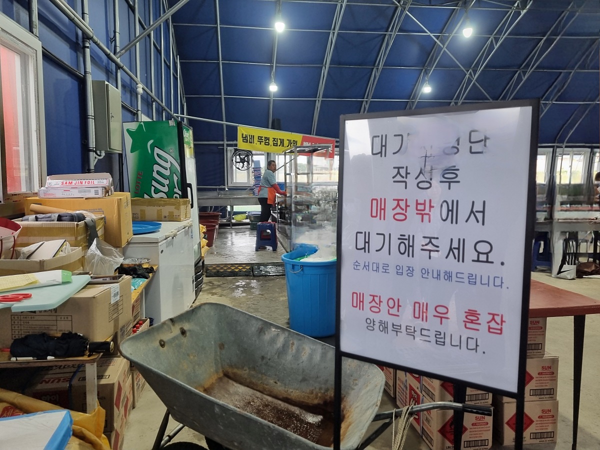 주차장에 도착하면 한 사람은 빠르게 먹는 장소로 가서 줄을 서세요.