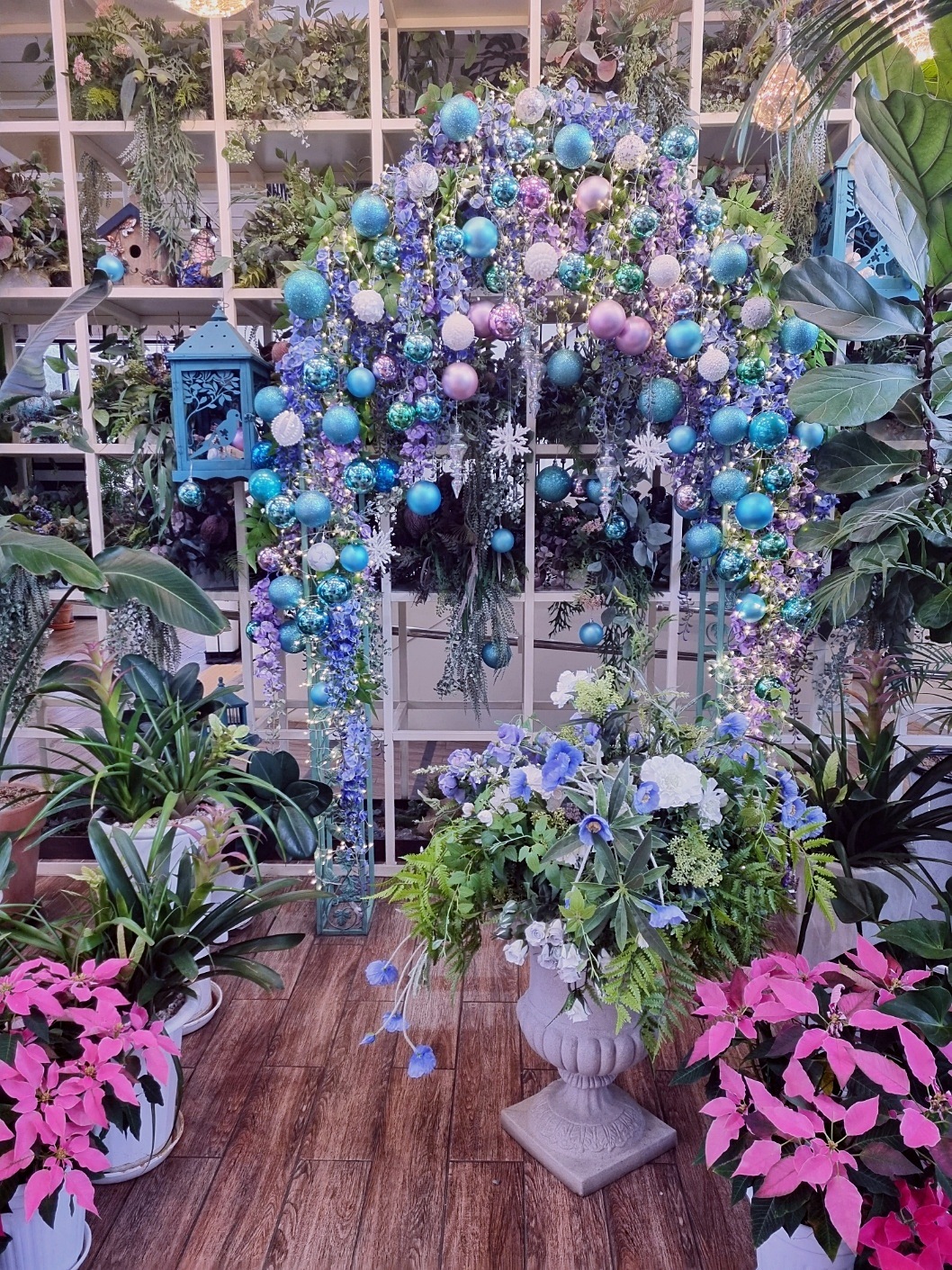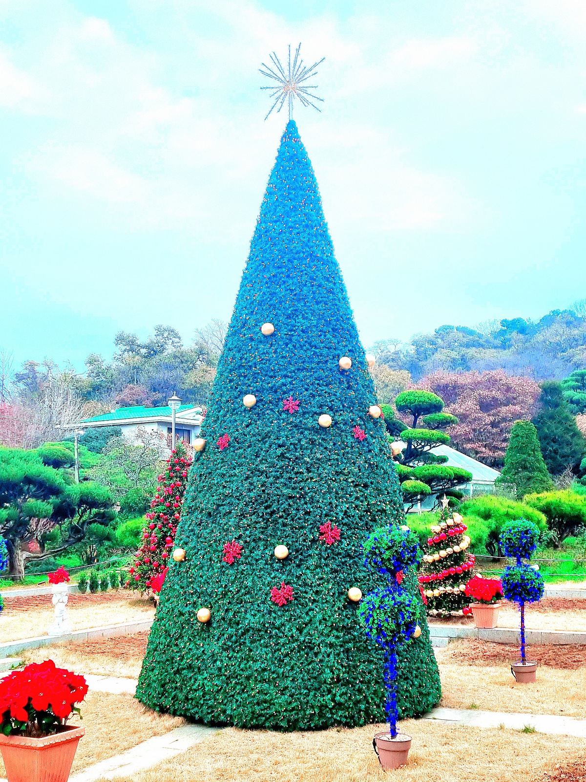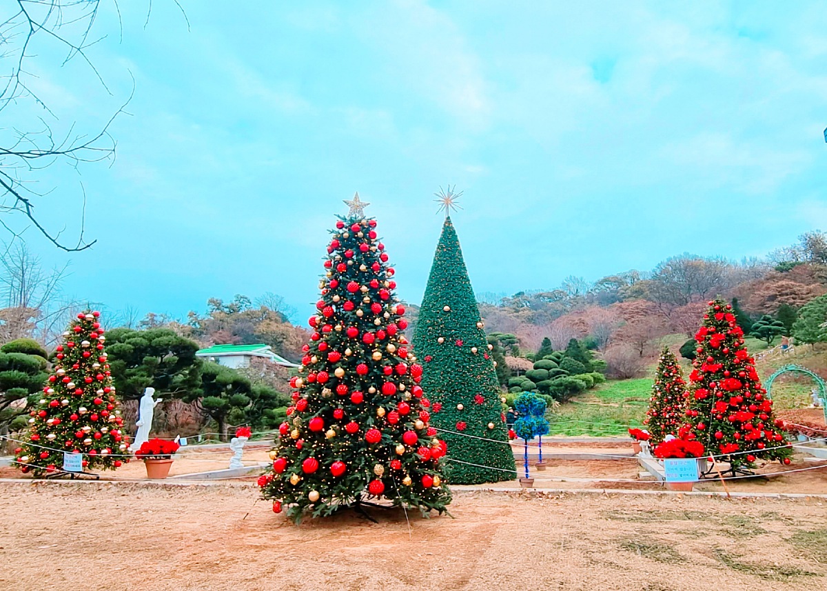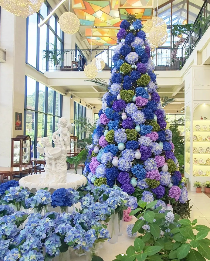 사계절 테마: 여름엔 수국, 겨울엔 대형 크리스마스 트리