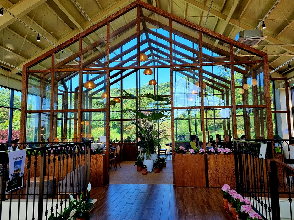 카페드첼시의 2층은 유리 온실 컨셉, 정원이 보이는 창가자리,