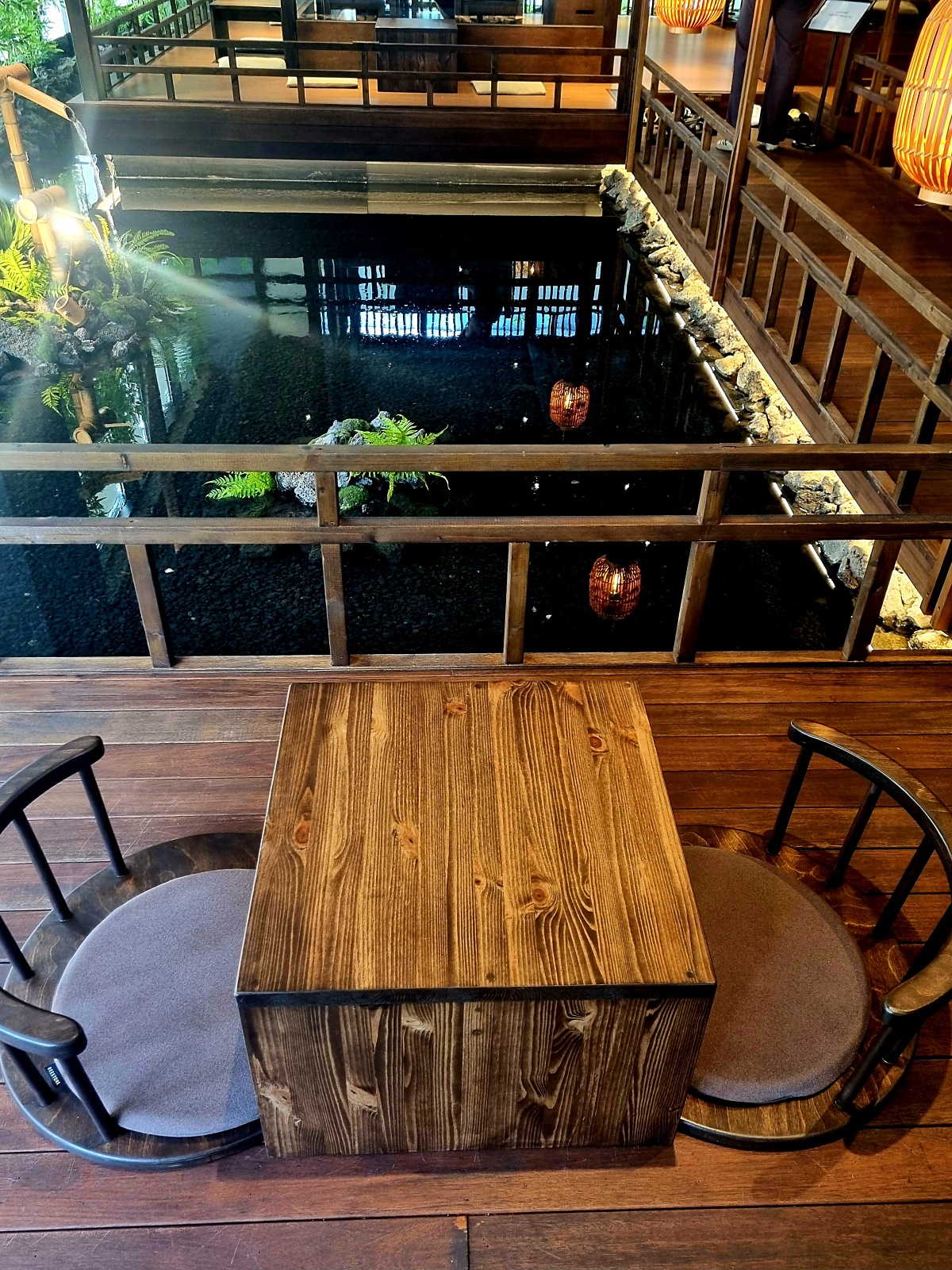 청수당 김포의 등, 대나무 장식과 나무 소재 인테리어, 작은 연못 등의
