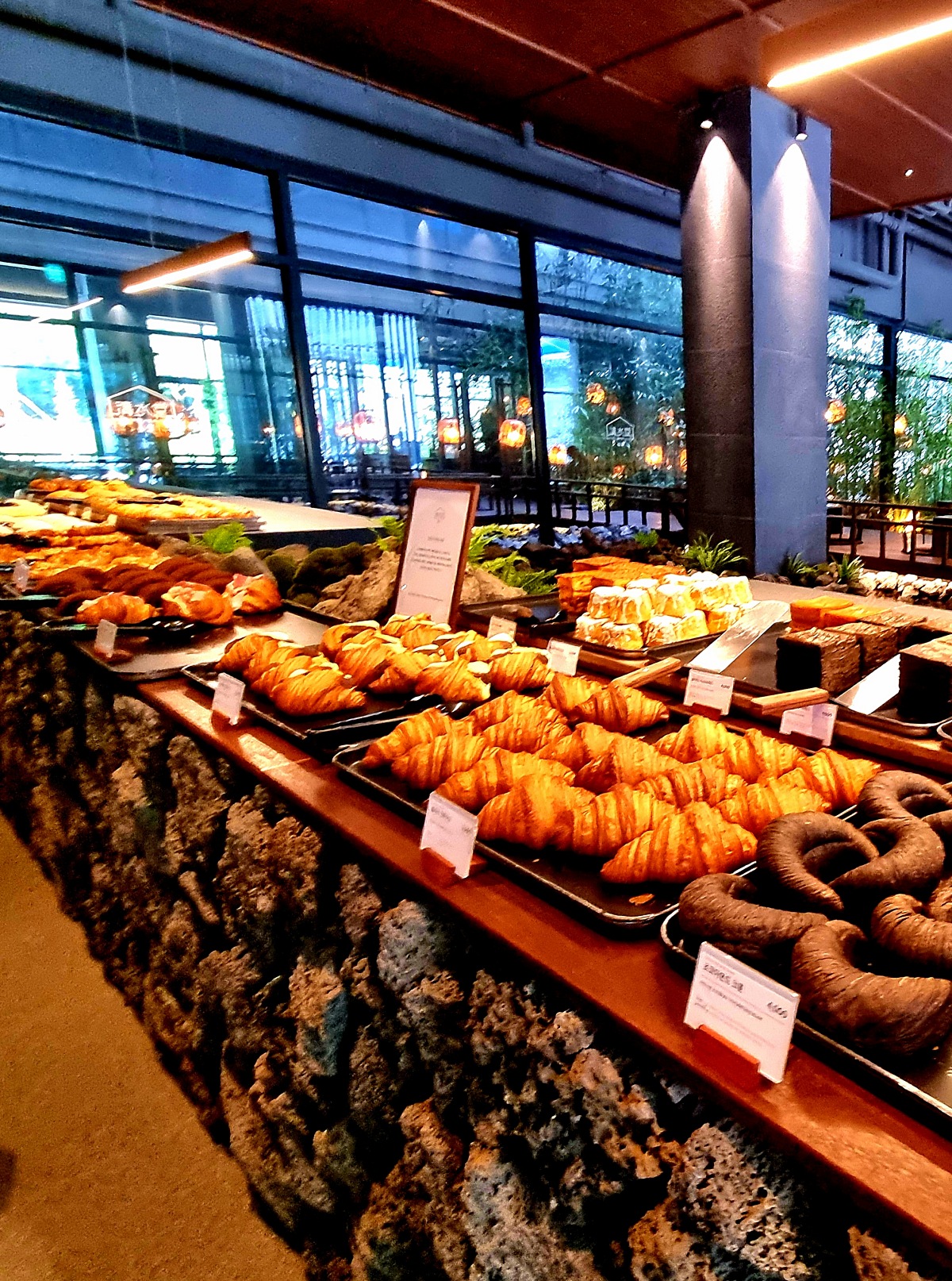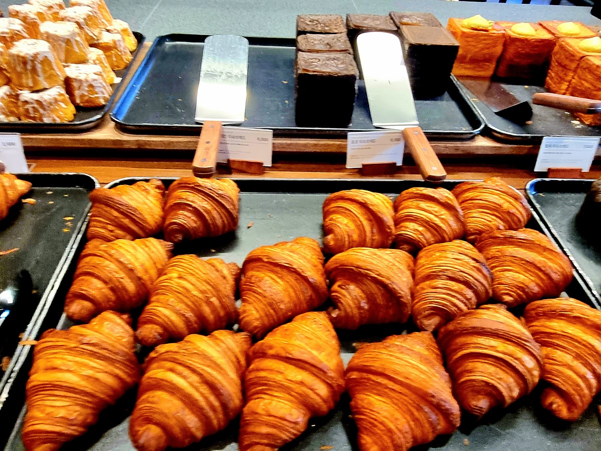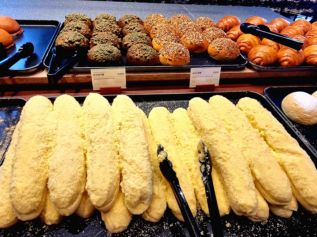 베이커리는 카운터 앞에 진열되어 있고 요즘 인기있는 종류의 빵들이 많았습니다.