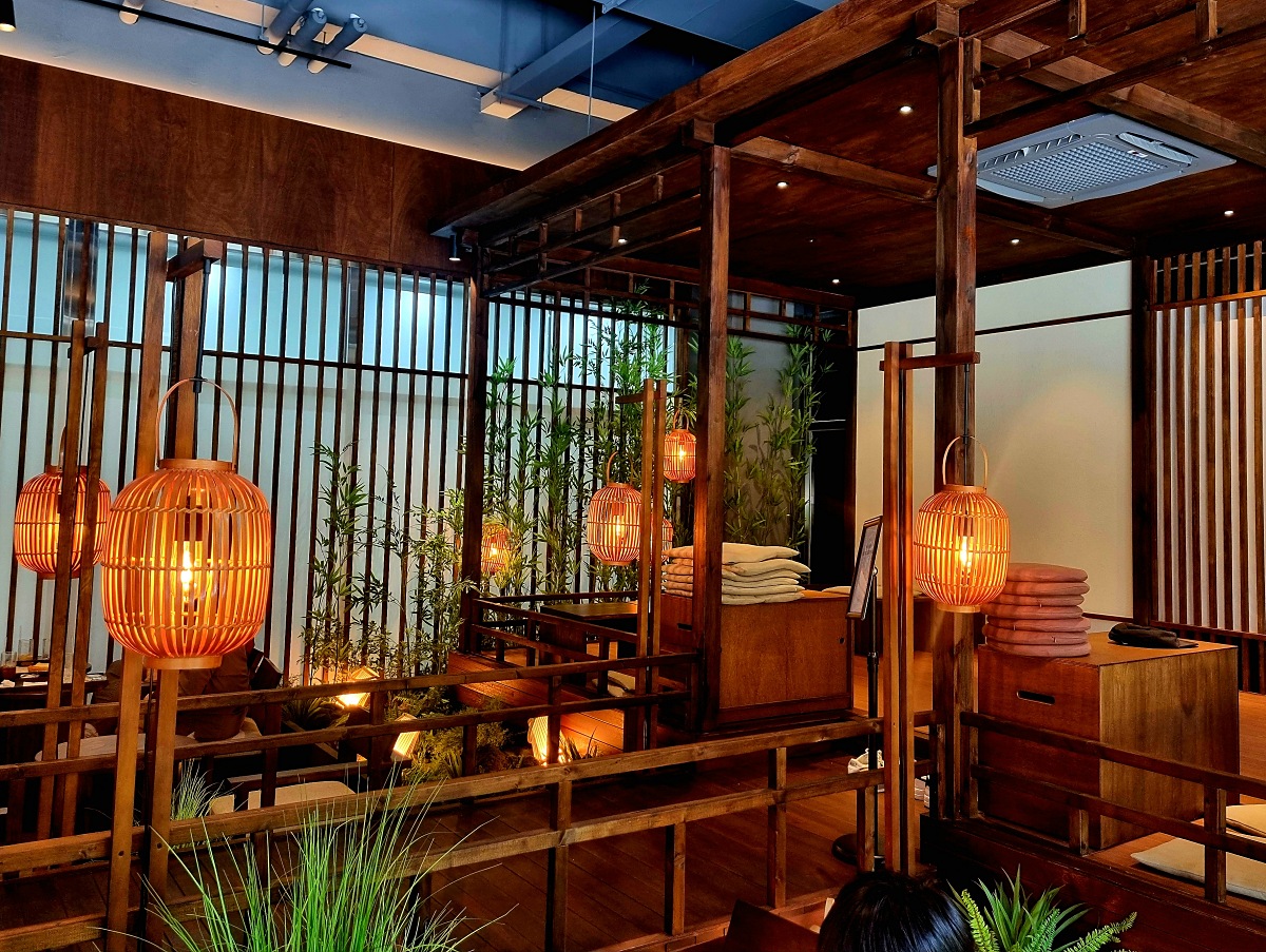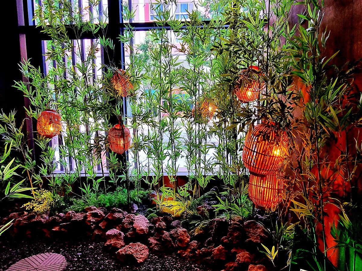 청수당 김포의 등, 대나무 장식과 나무 소재 인테리어, 작은 연못 등의