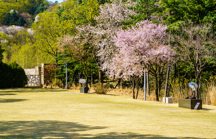 조각정원은 잔디밭 위에 세계적인 예술가들의 조각 작품이 전시된 공간입니다.