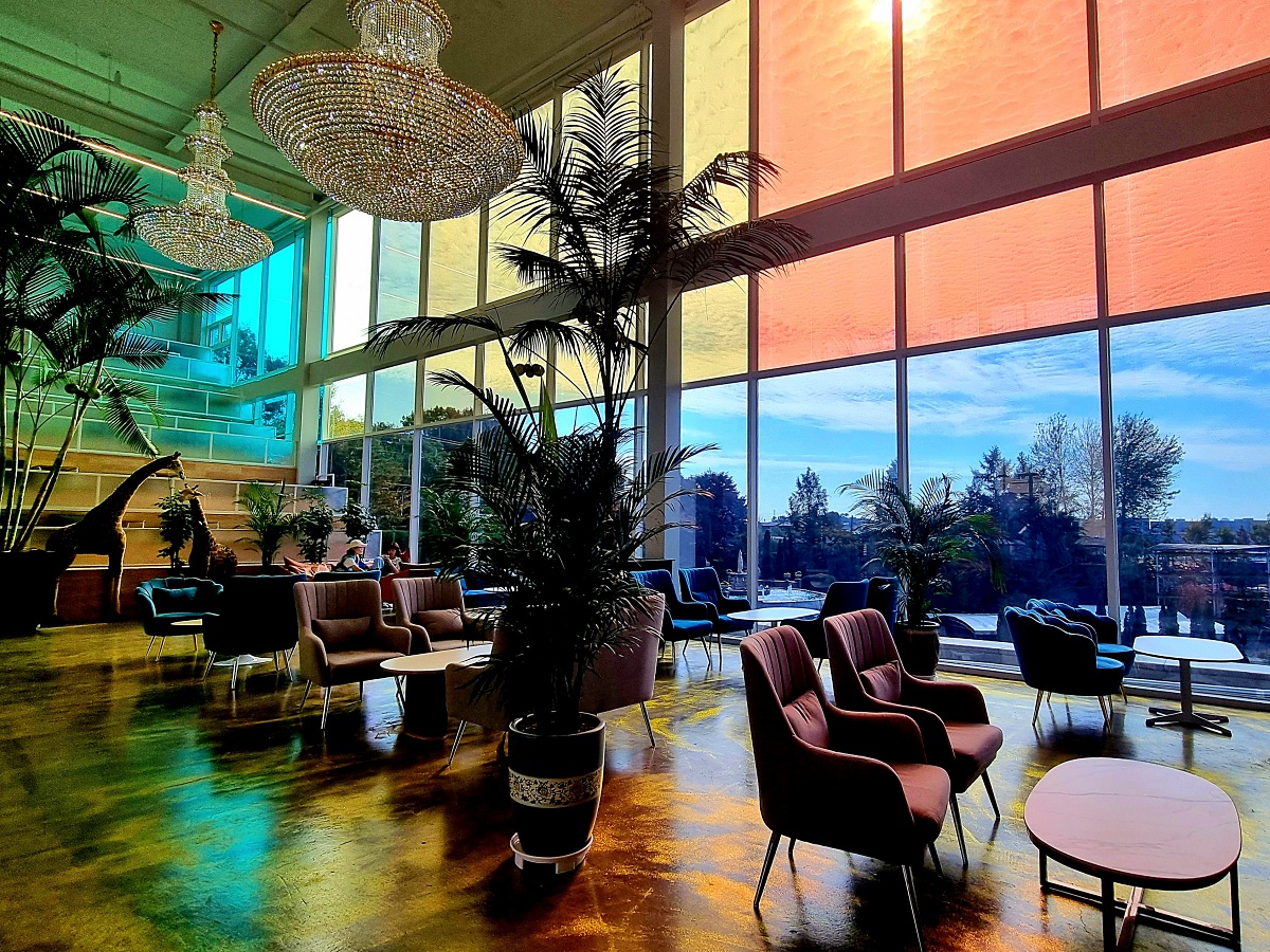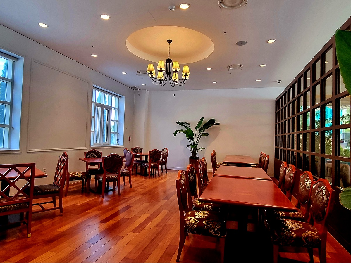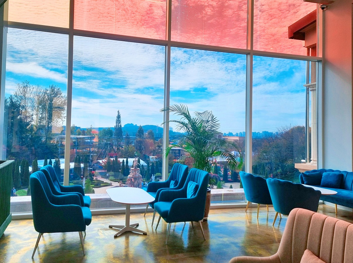 넓은 내부 공간과 유럽풍 인테리어와 실내 분수, 대형 샹들리에가 우아한 분위기를 만들고