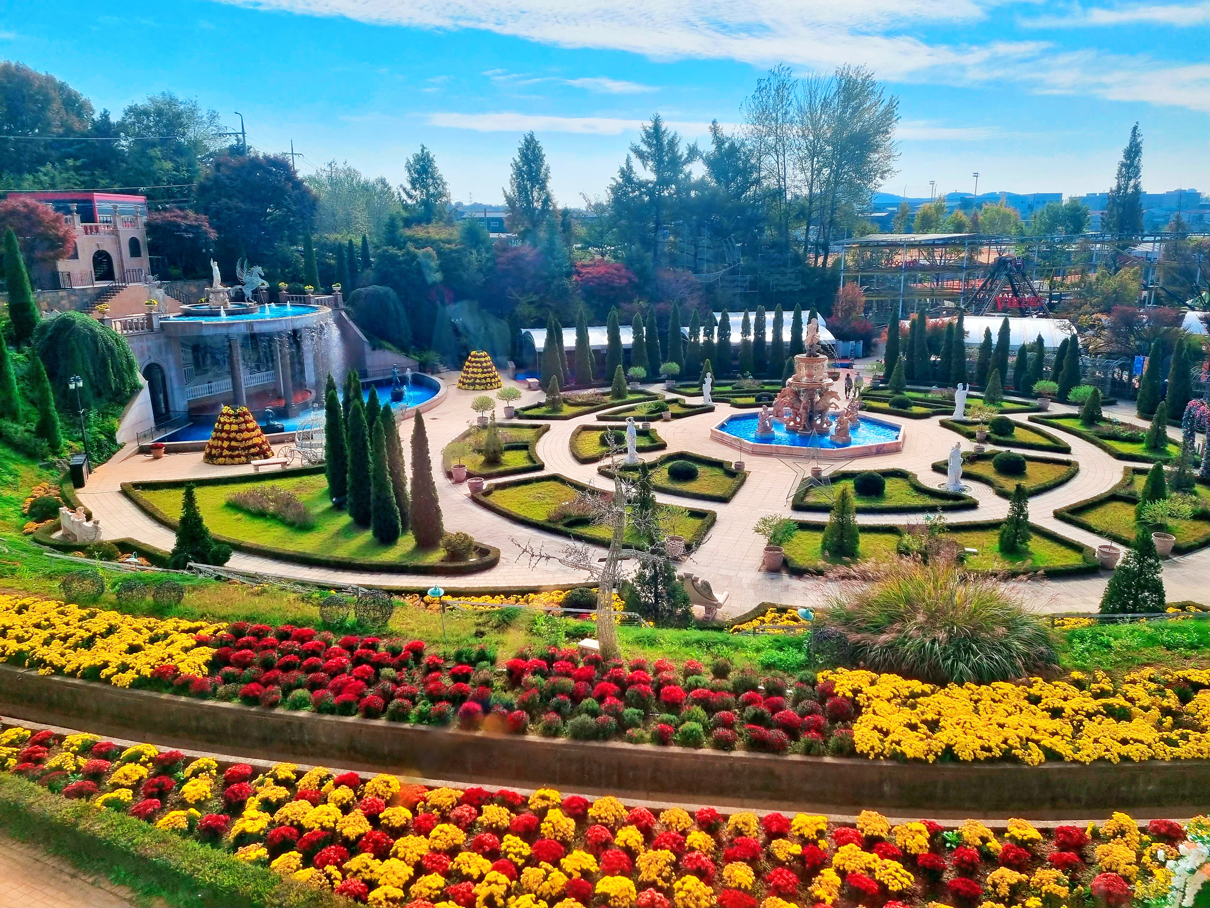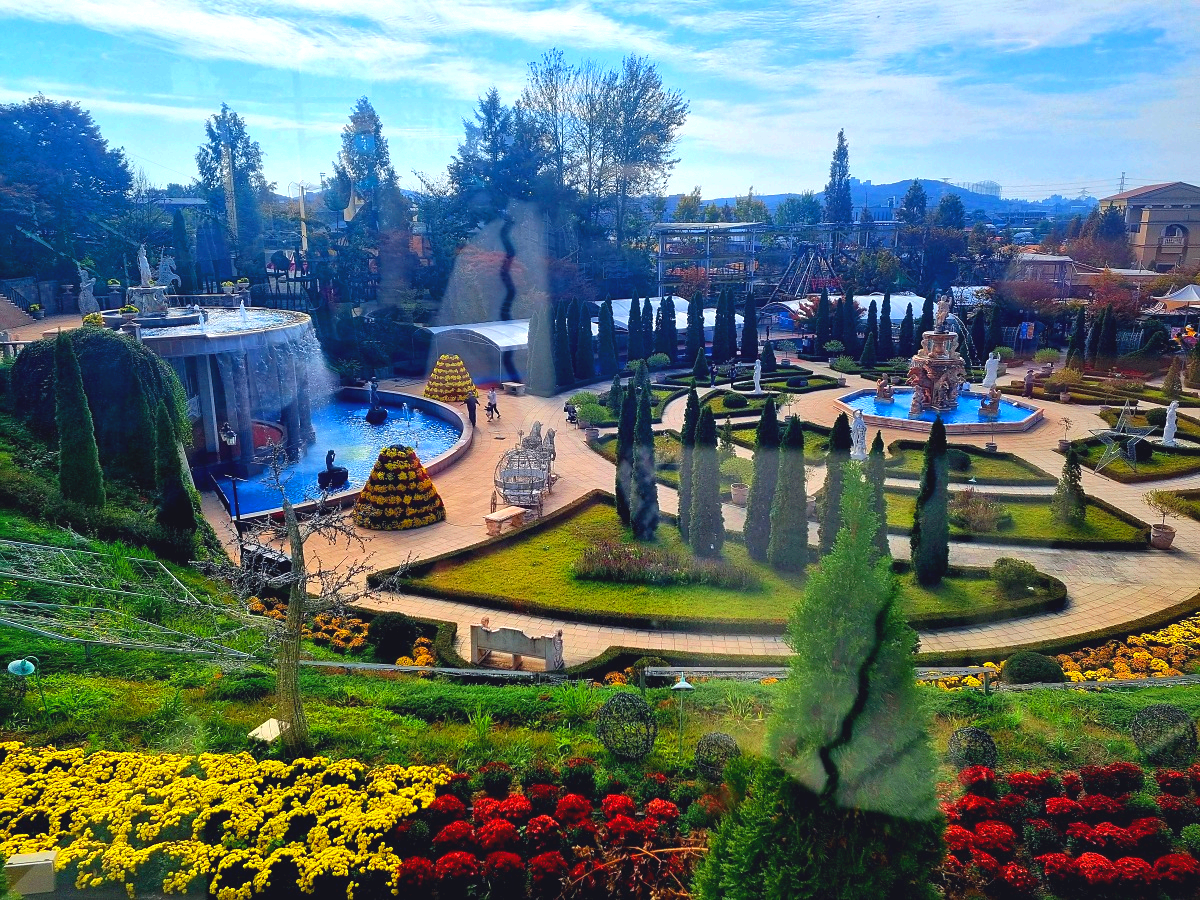 보스코 카페 안에서 보면 내려다 보는거라 넓은 정원가 분수, 국화축제의 꽃까지 한눈에 보여서 정말 예쁩니다.
