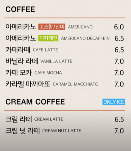 베스트 메뉴는 소금빵, 크루아상, 치즈 베이글, 모카빵, 바게트 순입니다.