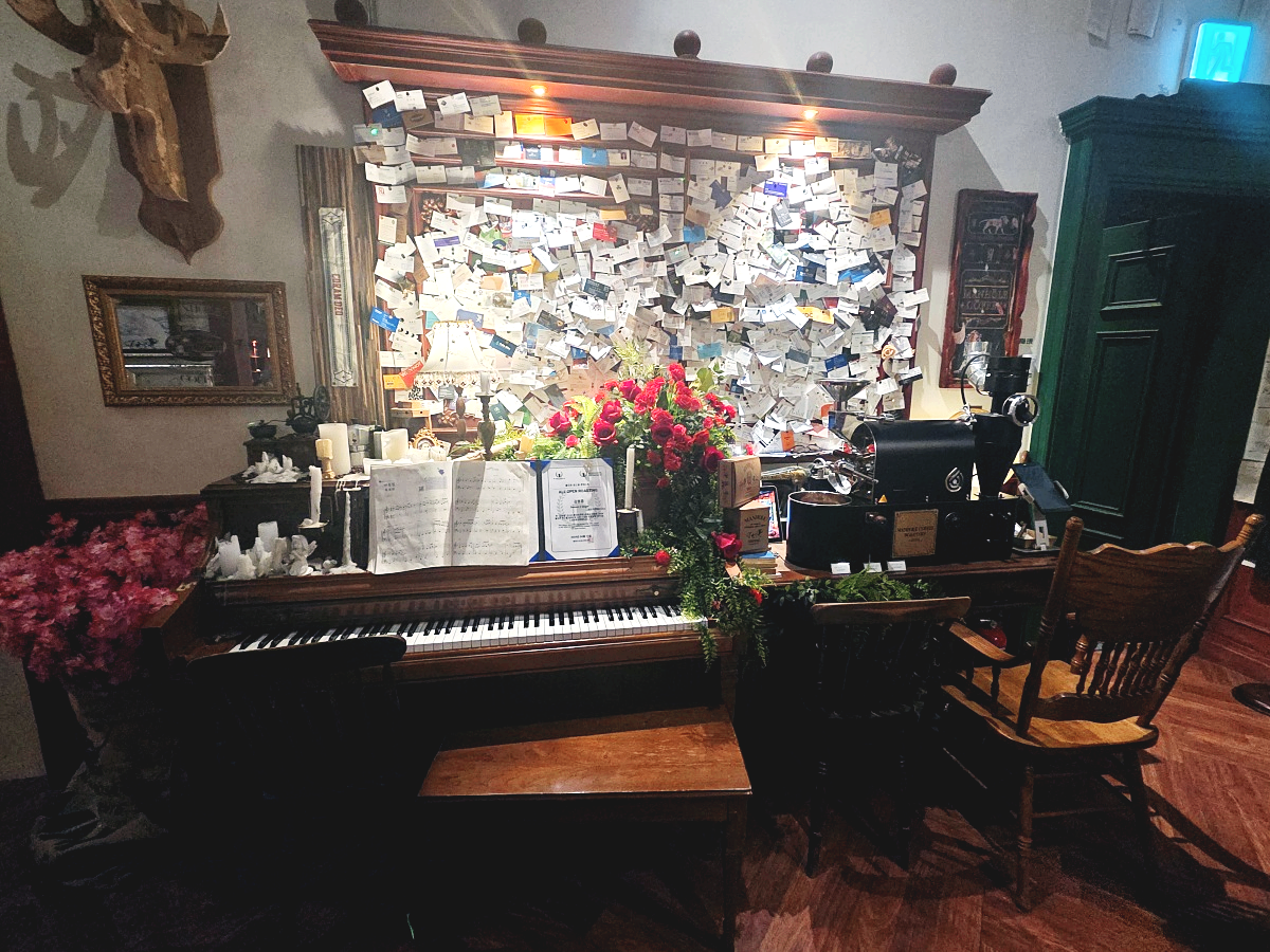 나무 피아노와 촛대, 금방이라도 누군가가 와서 연주할 것 같은 악보..