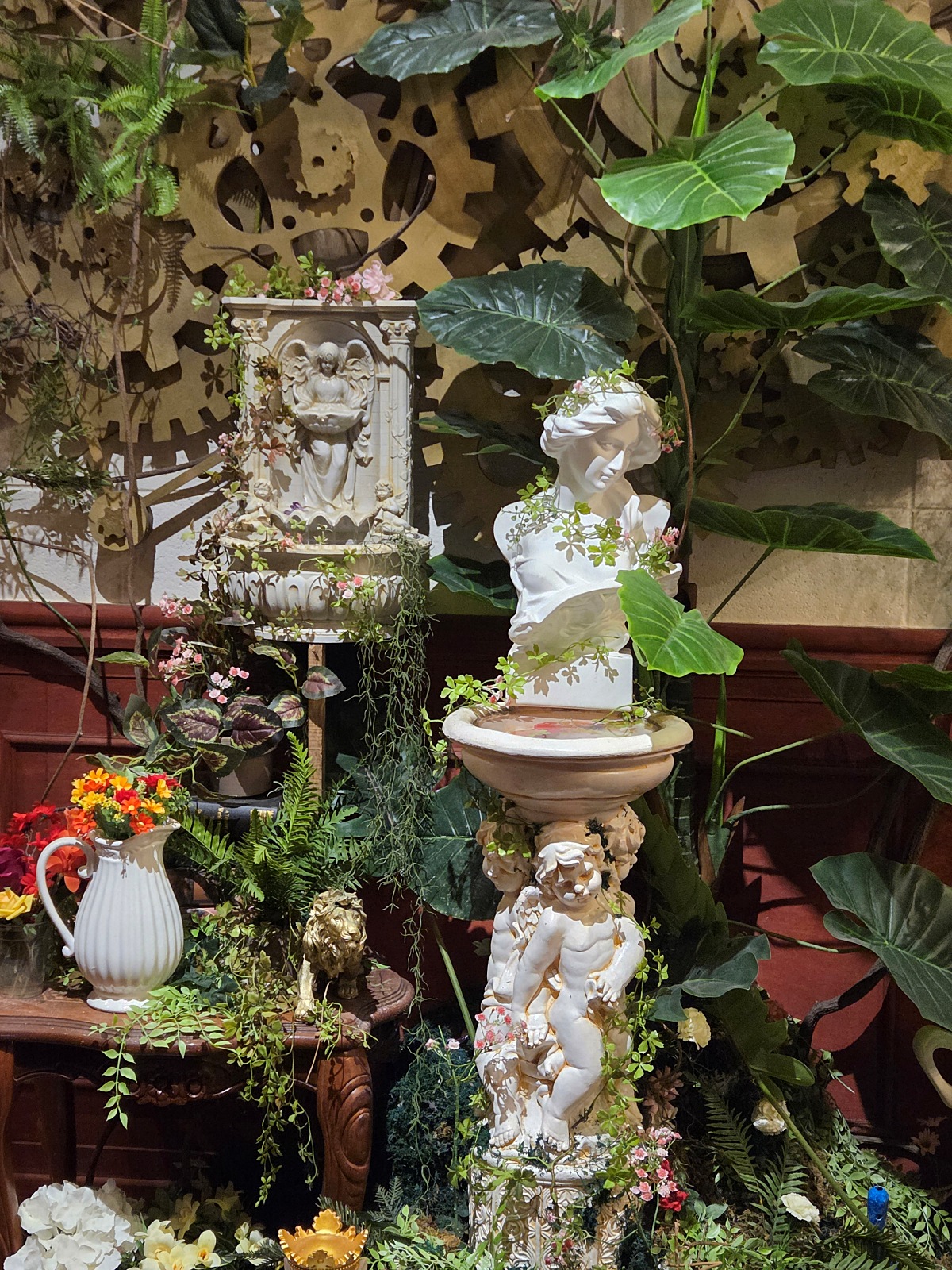 분수가 있는 정원이 연상되는 식물과 조각상들..
