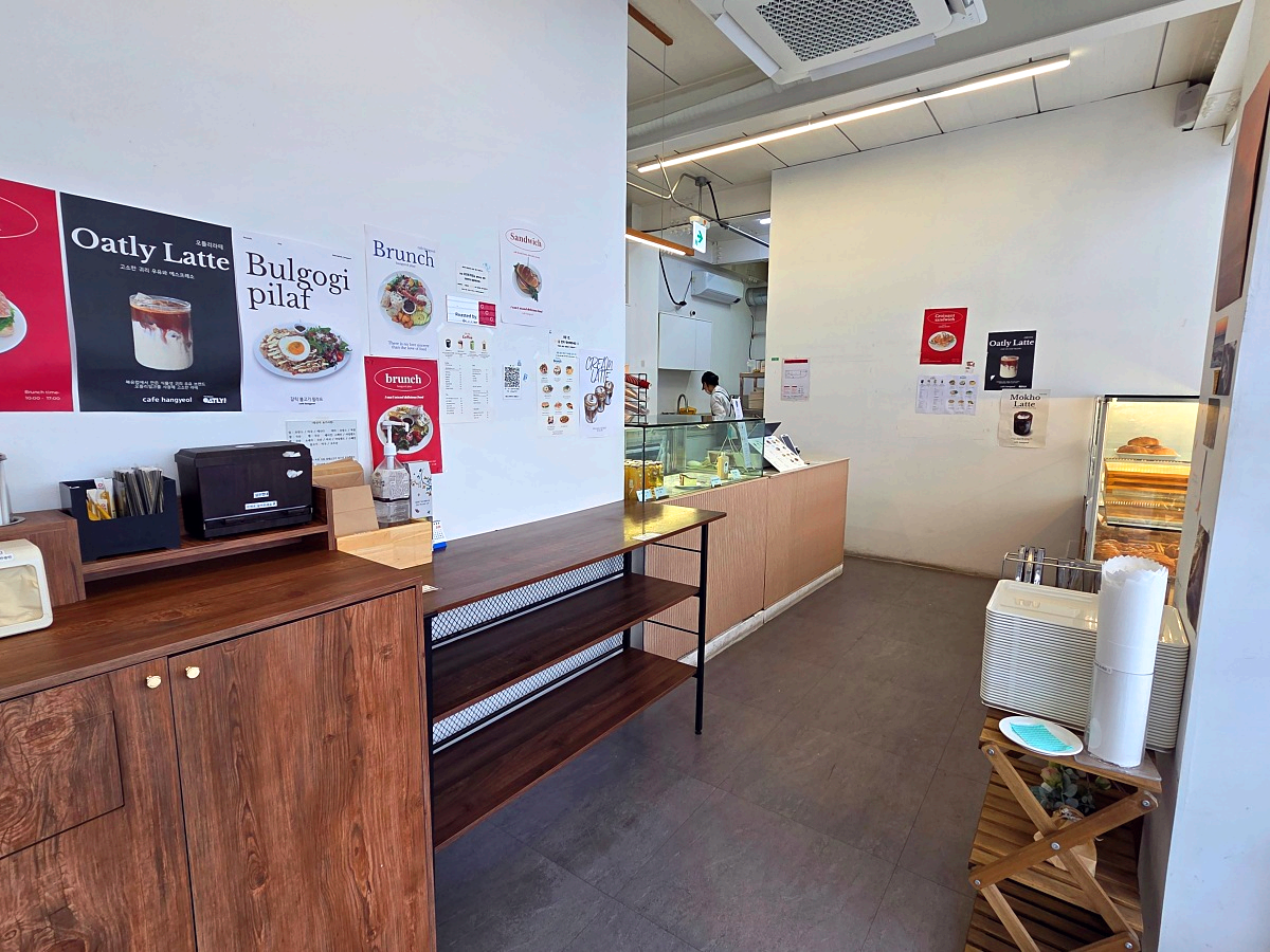 입구 문을 열고 들어가면 카운터와 빵 진열대가 있어요.