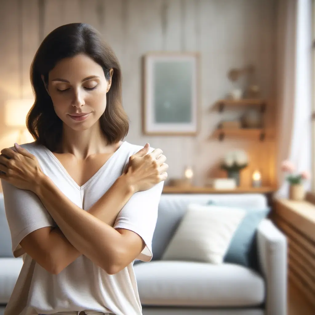 양팔을 가슴 앞에서 크로스한 다음 자신의 어깨를 토닥토닥하는 거예요.