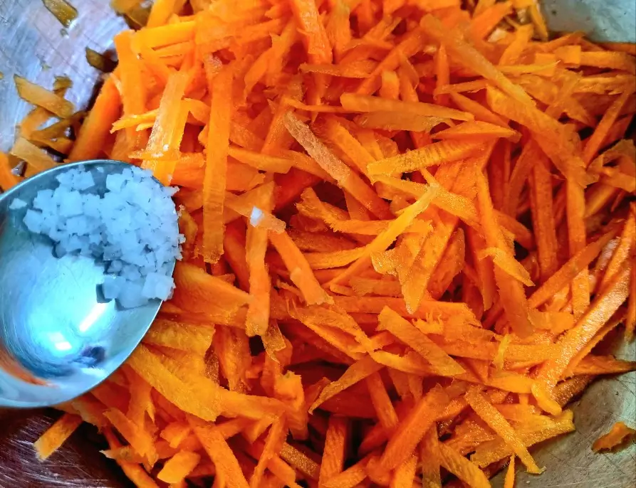2. 채친 당근에 소금 1/2T 정도 넣어 버무리고, 10분 후 물기 짜내기