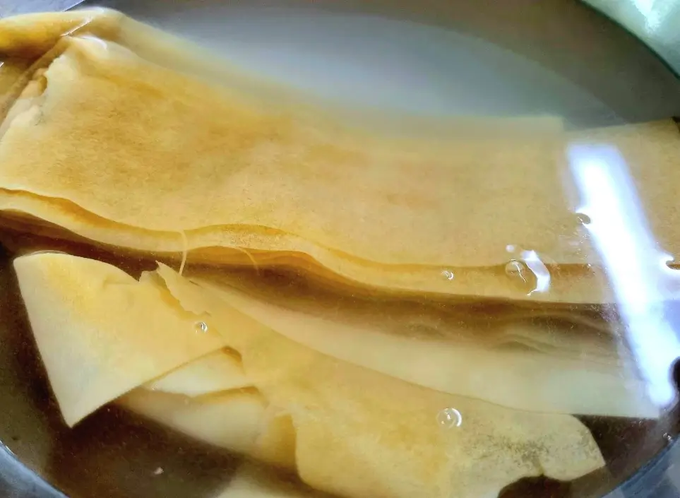 이렇게 뜨거운 물에 담궈주면 포두부가 부드러워지고 불순물도 제거됩니다.