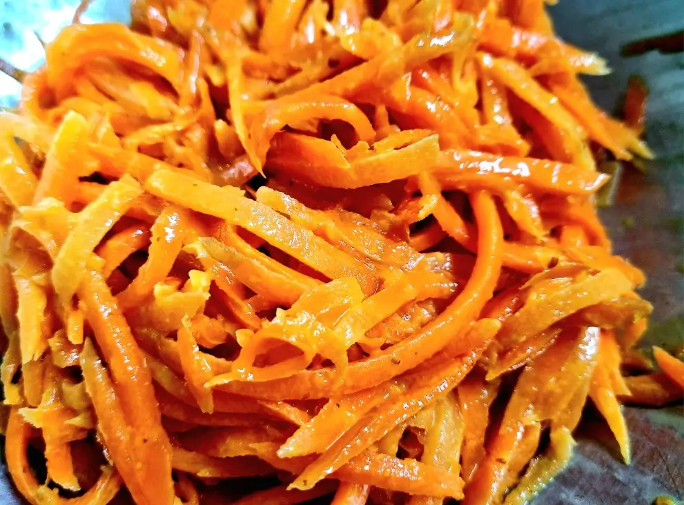 당근, 소금 1/2 T, 올리브오일 2T (참기름 대체 가능), 홀그레인 머스터드 2T (아이가 못 먹으면 허니머스터드), 레몬즙 2T, 꿀 또는 알룰로스 1.5T