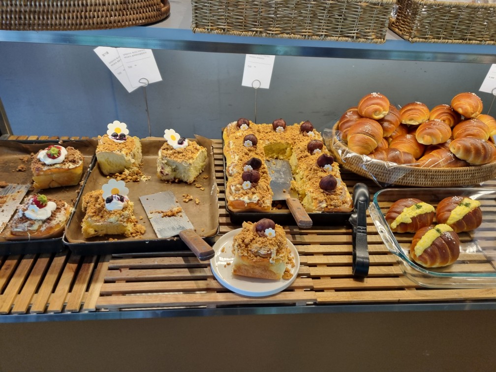 정원을 지나서 건물로 들어오면 정면에 카운터와 베이커리가 있어요.