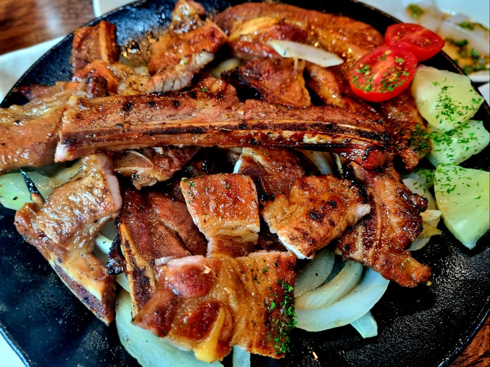 뜨거운 철판 위에 양파가 깔려 있고 그 위에 구워진 갈비, 파인애플, 방울토마토가 있었습니다.